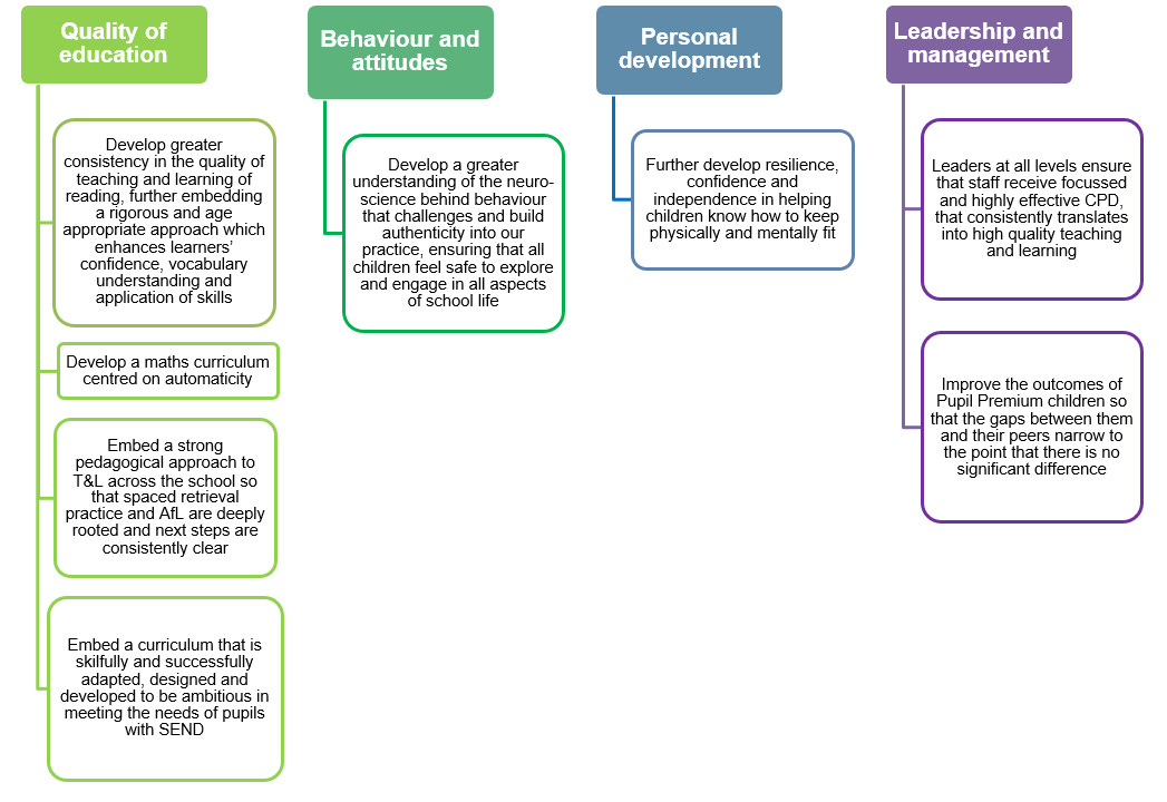 The priorities stem from an evidence base and aim to improve outcomes and the education experience of our children and families across four areas: Quality of Education; Behaviour and Attitudes; Personal Development and Leadership and Management.